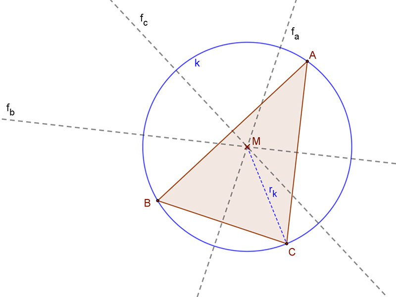 Az oldalfelező merőlegesek M metszéspontja tehát egyenlő távol van mindhárom csúcstól, ezért ha M pont körül AM=BM=CM sugárral kört húzunk, a kör át fog menni a háromszög mindhárom csúcsán.