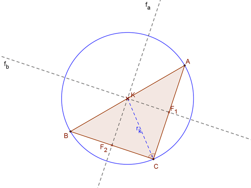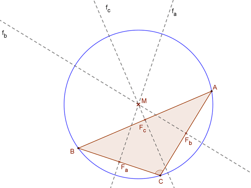 Az AB oldal felezőmerőlegese (fc) és a BC oldal felezőmerőlegese (fa) metszi egymást egy pontban (M), hiszen AB és BC nem párhuzamosak, ezért felezőmerőlegeseik sem azok