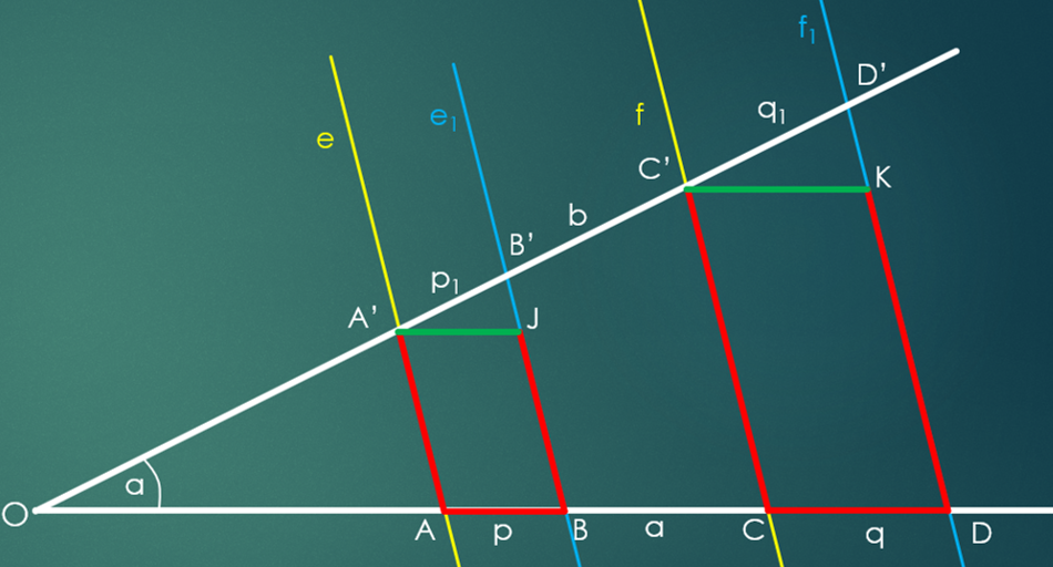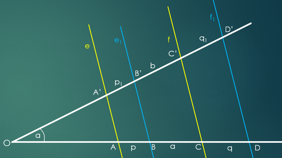 Ha egy szög szárait párhuzamos egyenesekkel metsszük, akkor az egyik szögszáron keletkező szakaszok hosszának aránya megegyezik a másik szögszáron keletkező megfelelő szakaszok hosszának arányával.