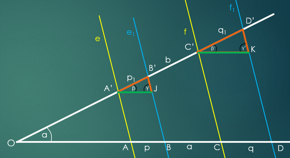 β és β’ egyik szögszára b egyenesre illeszkedik; másik két szögszár (A’J és C’K szakaszok) párhuzamosak egymással. γ és γ’ esetében hasonló a helyzet: mivel e és f egyenesek párhuzamosak egymással, illetve A’J és C’K szakaszok is párhuzamosak. β szög egyébként egyenlő α-val is, mivel egyik szögszáruk megegyezik, a másik két szár pedig párhuzamos egymással (a formaságok kedvéért a két szög külön betűvel van jelölve)